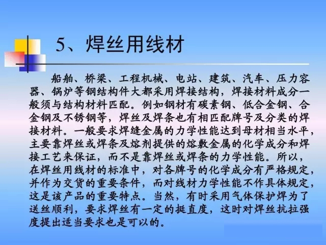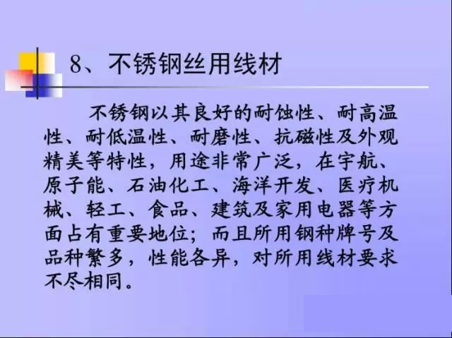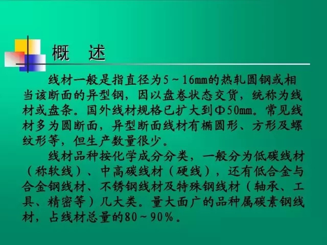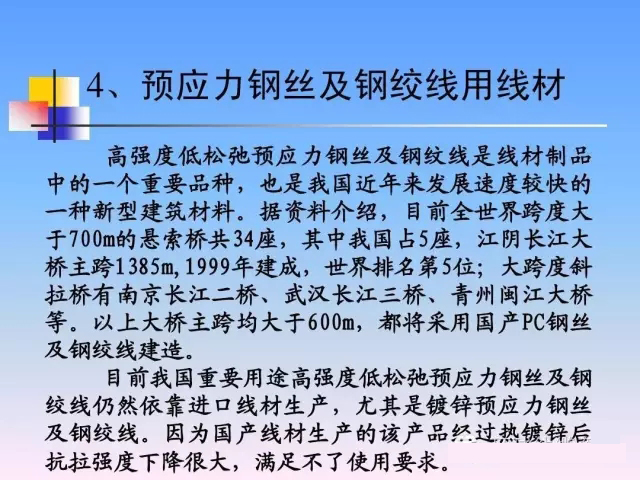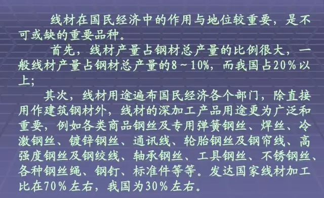 線材在國民經(jīng)濟(jì)中的作用與地位較重要, 線材在國民經(jīng)濟(jì)中的作用與地位較重要 , 是不 可或缺的重要品種。 可或缺的重要品種。 首先, 線材產(chǎn)量占鋼材總產(chǎn)量的比例很大, 首先 , 線材產(chǎn)量占鋼材總產(chǎn)量的比例很大 , 一 般線材產(chǎn)量占鋼材總產(chǎn)量的8 10% 而我國占20 20% 般線材產(chǎn)量占鋼材總產(chǎn)量的8~10%,而我國占20%以 上; 其次,線材用途遍布國民經(jīng)濟(jì)各個部門, 其次,線材用途遍布國民經(jīng)濟(jì)各個部門,除直接 用作建筑鋼材外, 用作建筑鋼材外,線材的深加工產(chǎn)品用途更為廣泛和 重要,例如各類商品鋼絲及專用彈簧鋼絲、焊絲、 重要,例如各類商品鋼絲及專用彈簧鋼絲、焊絲、冷 激鋼絲、鍍鋅鋼絲、通訊線、輪胎鋼絲及鋼簾線、 激鋼絲、鍍鋅鋼絲、通訊線、輪胎鋼絲及鋼簾線、高 強(qiáng)度鋼絲及鋼絞線、軸承鋼絲、工具鋼絲、不銹鋼絲、 強(qiáng)度鋼絲及鋼絞線、軸承鋼絲、工具鋼絲、不銹鋼絲、 各