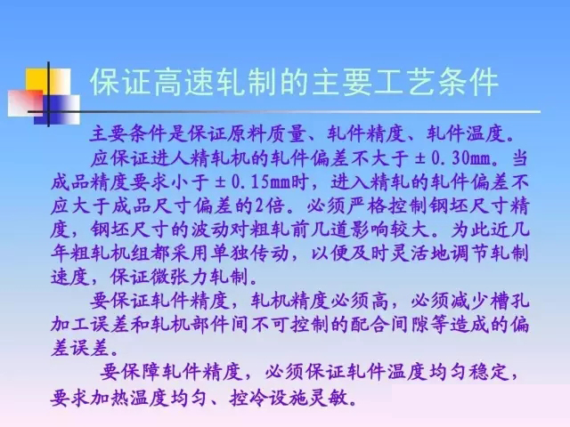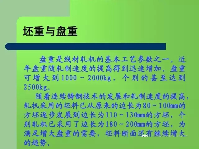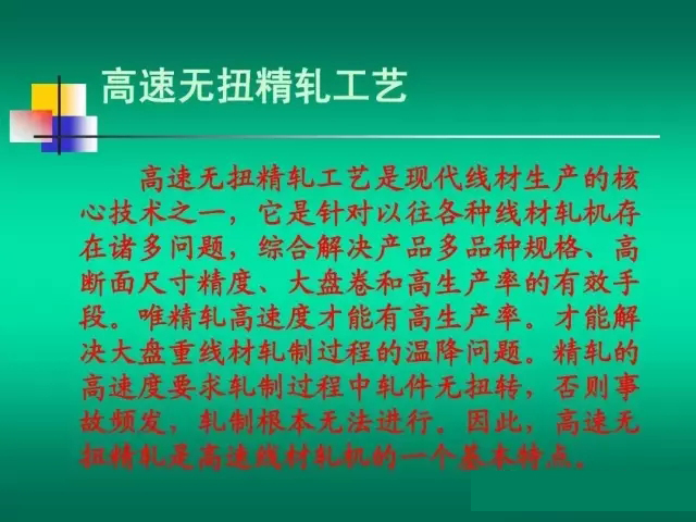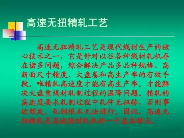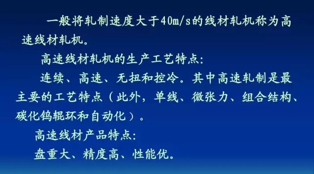 一般將軋制速度大于40m/s的線材軋機(jī)稱為高 一般將軋制速度大于 40m/s的線材軋機(jī)稱為高 40m/s 速線材軋機(jī)。 速線材軋機(jī)。 高速線材軋機(jī)的生產(chǎn)工藝特點(diǎn): 高速線材軋機(jī)的生產(chǎn)工藝特點(diǎn): 連續(xù)、 高速、無扭和控冷。 連續(xù) 、 高速 、 無扭和控冷 。 其中高速軋制是最 主要的工藝特點(diǎn)(此外,單線、微張力、組合結(jié)構(gòu)、 主要的工藝特點(diǎn) ( 此外 , 單線 、 微張力 、 組合結(jié)構(gòu) 、 碳化鎢輥環(huán)和自動化 )。 高速線材產(chǎn)品特點(diǎn): 高速線材產(chǎn)品特點(diǎn): 盤重大、精度高、性能優(yōu)。 盤重大、精度高、性能優(yōu)。