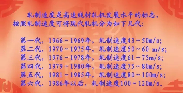 軋制速度是高速線材軋機(jī)發(fā)展水平的標(biāo)志, 軋制速度是高速線材軋機(jī)發(fā)展水平的標(biāo)志, 按照軋制速度可將現(xiàn)代軋機(jī)分為如下幾代: 按照軋制速度可將現(xiàn)代軋機(jī)分為如下幾代: 第一代,1966~1969年 軋制速度43 50m/s 43~ m/s; 第一代,1966~1969年,軋制速度43~50m/s; 第二代,1970~1975年 軋制速度50 50~ /s; 第二代,1970~1975年,軋制速度50~60 m/s; 第三代,1976~1978年 軋制速度61 61~ /s; 第三代,1976~1978年,軋制速度61~75m/s; 第四代,1979~1980年 軋制速度75 80m/s 75~ m/s; 第四代,1979~1980年,軋制速度75~80m/s; 第五代,1981~1985年 軋制速度80 100m/s 80~ m/s; 第五代,1981~1985年,軋制速度80~100m/s; 第六代,1986年以后 軋制速度100 120m/s 年以后, 100~ m/s。 第六代,1986年以后,軋制速度100~120m/s。