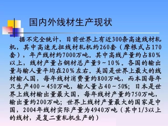 國內(nèi)外線材生產(chǎn)現(xiàn)狀 據(jù)不完全統(tǒng)計(jì),目前世界上有近300 300條高速線材軋 據(jù)不完全統(tǒng)計(jì),目前世界上有近300條高速線材軋 其中高速無扭線材軋機(jī)約260 260套 摩根式占170 機(jī) , 其中高速無扭線材軋機(jī)約 260 套 ( 摩根式占 170 年產(chǎn)線材約7000萬噸。其中高線產(chǎn)量約占80 7000萬噸 80% 套),年產(chǎn)線材約7000萬噸。其中高線產(chǎn)量約占80% 以上, 線材產(chǎn)量占鋼材總產(chǎn)量9 10% 以上 , 線材產(chǎn)量占鋼材總產(chǎn)量 9 ~ 10 % 。 各國的輸出 量與輸人量平均在20 左右。 20% 量與輸人量平均在20%左右。美國是世界上最大的線 材輸人國, 每年線材消費(fèi)量約800萬噸, 800萬噸 材輸人國 , 每年線材消費(fèi)量約 800 萬噸 , 而本國每年 只生產(chǎn)400 450萬噸 輸人量占40 50% 400~ 萬噸, 40~ 只生產(chǎn) 400 ~ 450 萬噸 , 輸人量占 40 ~ 50% ; 日本是世 界上線材輸出量最大國, 每年線材產(chǎn)量約750萬噸, 750萬噸 界上線材輸出量最大國 , 每年線材產(chǎn)量約 750 萬噸 , 輸出量約200萬噸; 200萬噸 輸出量約 200 萬噸 ; 世界上線材產(chǎn)量最大的國家是中 2004年線材實(shí)際產(chǎn)量為 4940萬噸 其中1 年線材實(shí)際產(chǎn)量為4940萬噸( 國 , 2004 年線材實(shí)際產(chǎn)量為 4940 萬噸 ( 其中 1/3 以上 的線材,是復(fù)二重軋機(jī)生產(chǎn)的) 的線材,是復(fù)二重軋機(jī)生產(chǎn)的)