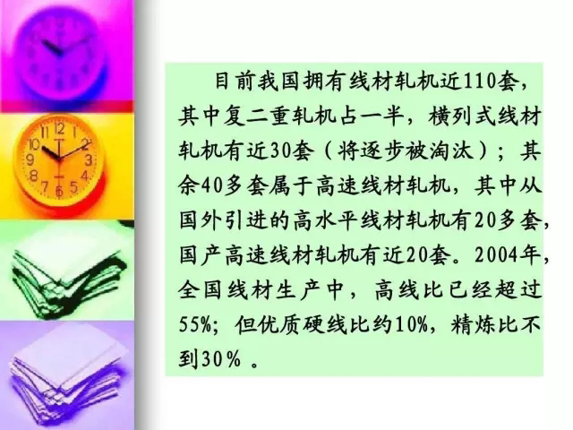 目前我國擁有線材軋機(jī)近110套 目前我國擁有線材軋機(jī)近 110套, 110 其中復(fù)二重軋機(jī)占一半, 其中復(fù)二重軋機(jī)占一半,橫列式線材 軋機(jī)有近30套 將逐步被淘汰) 軋機(jī)有近30套(將逐步被淘汰);其 30 40多套屬于高速線材軋機(jī) 多套屬于高速線材軋機(jī), 余40多套屬于高速線材軋機(jī),其中從 國外引進(jìn)的高水平線材軋機(jī)