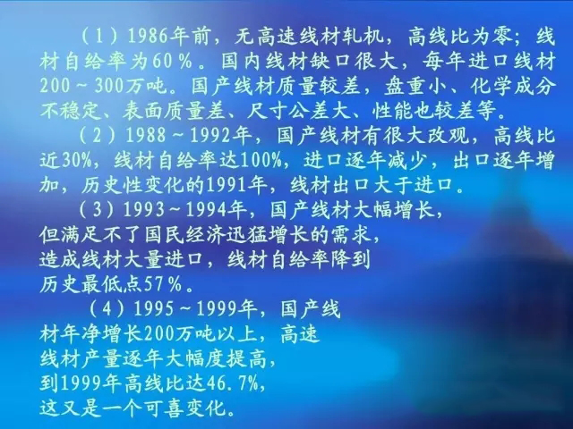 1986年前 無高速線材軋機(jī), 高線比為零; 年前, ( l ) 1986 年前 , 無高速線材軋機(jī) , 高線比為零 ; 線 60% 國內(nèi)線材缺口很大, 材自給率為 60 % 。 國內(nèi)線材缺口很大 , 每年進(jìn)口線材 200~ 300萬噸 國產(chǎn)線材質(zhì)量較差, 盤重小、 萬噸。 200 ~ 300 萬噸 。 國產(chǎn)線材質(zhì)量較差 , 盤重小 、 化學(xué)成分 不穩(wěn)定、表面質(zhì)量差、尺寸公差大、性能也較差等。 不穩(wěn)定、表面質(zhì)量差、尺寸公差大、性能也較差等。 1988~ 1992年 國產(chǎn)線材有很大改觀, ( 2 ) 1988 ~ 1992 年 , 國產(chǎn)線材有很大改觀 , 高線比 30% 線材自給率達(dá)100 100% 進(jìn)口逐年減少, 近30%,線材自給率達(dá)100%,進(jìn)口逐年減少,出口逐年增 歷史性變化的1991 1991年 線材出口大于進(jìn)口。 加,歷史性變化的1991年,線材出口大于進(jìn)口。 1993~1994年 國產(chǎn)線材大幅增長, (3)1993~1994年,國產(chǎn)線材大幅增長, 但滿足不了國民經(jīng)濟(jì)迅猛增長的需求, 但滿足不了國民經(jīng)濟(jì)迅猛增長的需求, 造成線材大量進(jìn)口, 造成線材大量進(jìn)口,線材自給率降到 歷史最低點(diǎn)57 57% 歷史最低點(diǎn)57%。 1995~1999年 (4)1995~1999年,國產(chǎn)線 材年凈增長200萬噸以上, 200萬噸以上 材年凈增長200萬噸以上,高速 線材產(chǎn)量逐年大幅度提高, 線材產(chǎn)量逐年大幅度提高, 1999年高線比達(dá)46. 年高線比達(dá)46 到1999年高線比達(dá)46.7%, 這又是一個可喜變化。 這又是一個可喜變化。