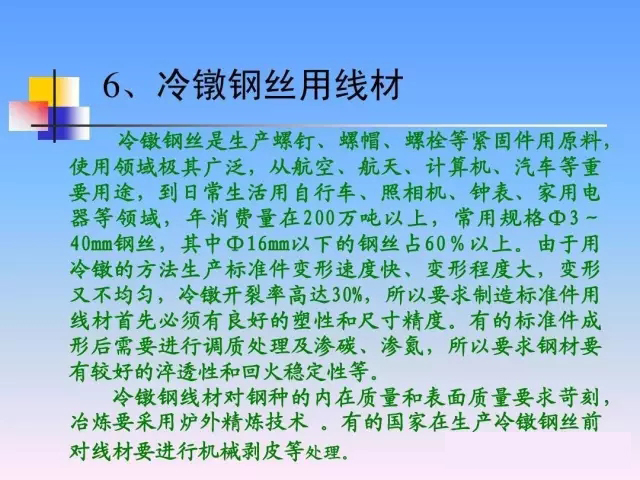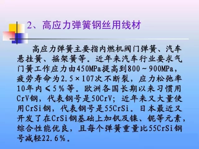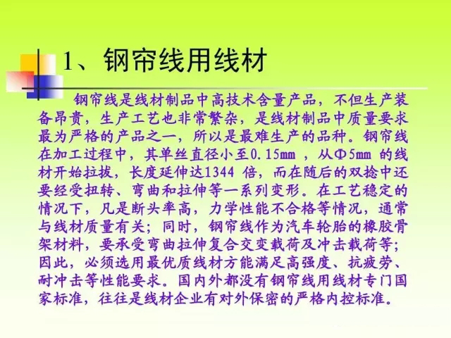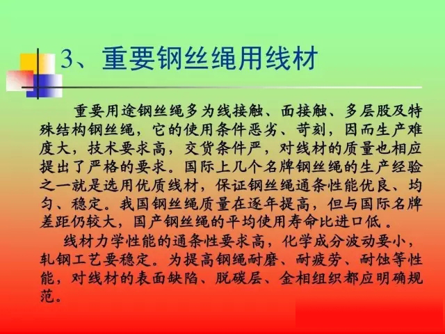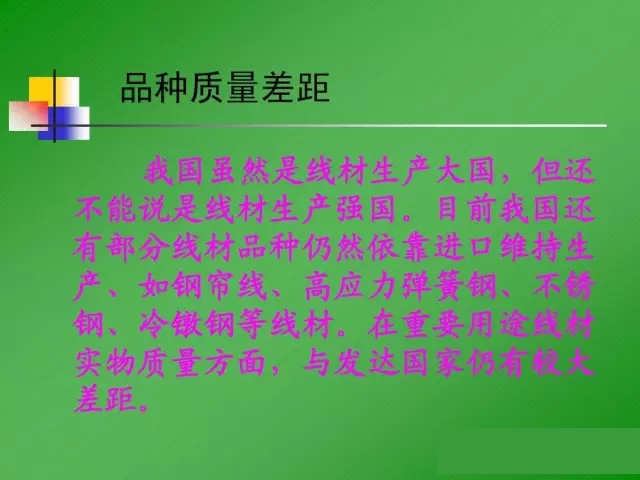 品種質(zhì)量差距 我國雖然是線材生產(chǎn)大國,但還 我國雖然是線材生產(chǎn)大國, 不能說是線材生產(chǎn)強(qiáng)國。 不能說是線材生產(chǎn)強(qiáng)國。目前我國還 有部分線材品種仍然依靠進(jìn)口維持生 如鋼簾線、高應(yīng)力彈簧鋼、 產(chǎn)、如鋼簾線、高應(yīng)力彈簧鋼、不銹 冷鐓鋼等線材。 鋼、冷鐓鋼等線材。在重要用途線材 實(shí)物質(zhì)量方面,與發(fā)達(dá)國家仍有較大 實(shí)物質(zhì)量方面, 差距。 差距。