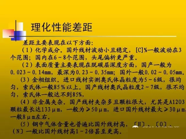理化性能差距 差距主要表現(xiàn)在以下方面: 差距主要表現(xiàn)在以下方面: 化學(xué)成分。國外線材波動小且穩(wěn)定,[C]%一般波動在 一般波動在3 (l)化學(xué)成分。國外線材波動小且穩(wěn)定,[C]%一般波動在3 個范圍;國內(nèi)在6 個范圍,頭尾偏析更嚴(yán)重。 個范圍;國內(nèi)在6~8個范圍,頭尾偏析更嚴(yán)重。 表面質(zhì)量主要表現(xiàn)在脫碳層深度方面, (2)表面質(zhì)量主要表現(xiàn)在脫碳層深度方面,國產(chǎn)一般為 0.023~0.14mm,最深為0.23 0.35mm;國外一般0.02 0.05mm。 0.23~ 0.02~ 0.023~0.14mm,最深為0.23~0.35mm