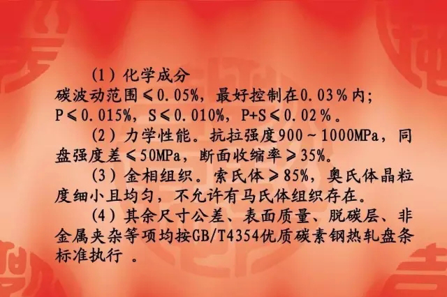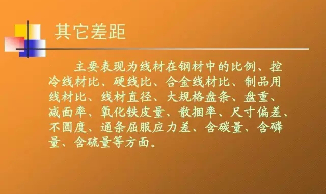 其它差距 主要表現(xiàn)為線材在鋼材中的比例、 主要表現(xiàn)為線材在鋼材中的比例 、 控 冷線材比、硬線比、合金線材比、 冷線材比 、 硬線比 、 合金線材比 、 制品用 線材比、線材直徑、大規(guī)格盤條、盤重、 線材比 、 線材直徑 、 大規(guī)格盤條 、 盤重 、 減面率、氧化鐵皮量、散捆率、尺寸偏差、 減面率 、氧化鐵皮量 、 散捆率 、 尺寸偏差 、 不圓度、通條屈服應(yīng)力差、含碳量、 不圓度 、 通條屈服應(yīng)力差 、 含碳量 、 含磷 含硫量等方面。 量、含硫量等方面。