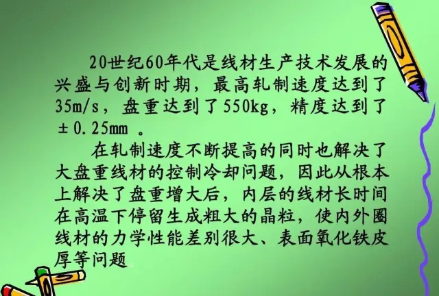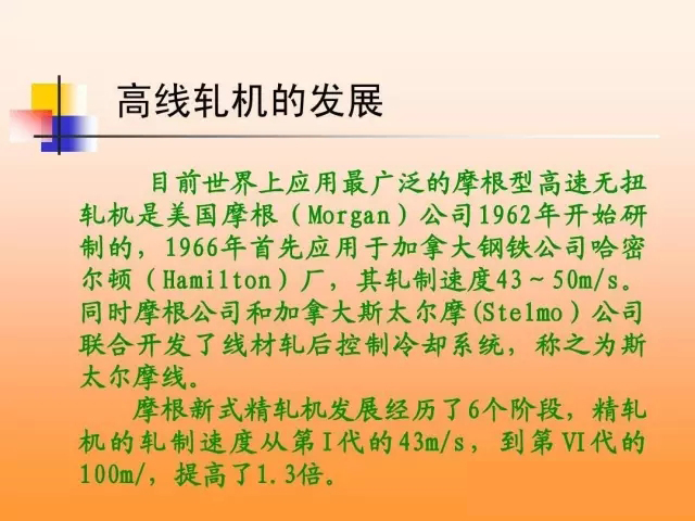 高線軋機(jī)的誕生 高速線材軋機(jī)與其他先進(jìn)技術(shù)一樣也是時(shí)代的產(chǎn)物, 高速線材軋機(jī)與其他先進(jìn)技術(shù)一樣也是時(shí)代的產(chǎn)物 , 是冶金技術(shù)、電傳電控技術(shù)、機(jī)械制造技術(shù)的綜合產(chǎn)物。 是冶金技術(shù)、電傳電控技術(shù)、機(jī)械制造技術(shù)的綜合產(chǎn)物。 據(jù)記載,世界上第一臺線材軋機(jī)問世于17世紀(jì), 17世紀(jì) 據(jù)記載,世界上第一臺線材軋機(jī)問世于17世紀(jì),當(dāng)時(shí) 是用鍛坯軋制線材。18世紀(jì)中期出現(xiàn)了比較正規(guī)的線材軋 是用鍛坯軋制線材。18世紀(jì)中期出現(xiàn)了比較正規(guī)的線材軋 由粗軋及精軋兩列橫列式軋機(jī)組成, 機(jī) , 由粗軋及精軋兩列橫列式軋機(jī)組成 , 其軋速不超過 m/s。 8m/s。 20世紀(jì)初 開發(fā)了半連續(xù)式軋機(jī)。 世紀(jì)初, 20 世紀(jì)初 , 開發(fā)了半連續(xù)式軋機(jī) 。 粗軋及中軋采用 連軋,精軋機(jī)組仍采用橫列式軋機(jī)( 連軋,精軋機(jī)組仍采用橫列式軋機(jī)(復(fù)二重軋機(jī)是半連續(xù) 式軋機(jī)的一個特例) 軋制速度提高到16m/s, 16m/s 式軋機(jī)的一個特例 ) 。 軋制速度提高到 16m/s , 盤重增加 100kg左右,尺寸精度較橫列式為好, kg左右 到 100kg 左右 , 尺寸精度較橫列式為好 , 但品種及質(zhì)量未 有根本好轉(zhuǎn)。 有根本好轉(zhuǎn)。