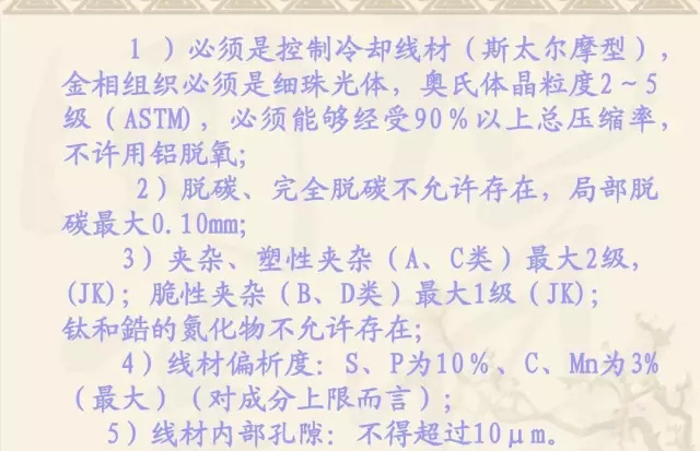 ;國外一般0.02~0.05mm。 (3)金相組織。進(jìn)口線材實(shí)測奧氏體晶粒度為5 (3)金相組織。進(jìn)口線材實(shí)測奧氏體晶粒度為5~6級,很均 索氏體一般85 以上。國產(chǎn)線材奧氏晶粒度2 85% 勻,索氏體一般85%以上。國產(chǎn)線材奧氏晶粒度2~7級,很不均 索氏體一般達(dá)不到85% 85%, 勻,索氏體一般達(dá)不到85%, (4)非金屬夾雜。國產(chǎn)線材夾雜多且顆粒很大,尤其是A12O3 (4)非金屬夾雜。國產(chǎn)線材夾雜多且顆粒很大,尤其是A12O3 顆粒最長達(dá)133μm 一般為≥50μm,進(jìn)口國外線材最大≥30μm, 133μm, 顆粒最長達(dá)133μm,一般為≥50μm,進(jìn)口國外線材最大≥30μm, 一般8μm左右。 8μm左右 一般8μm左右。 (5)鋼中氣體含量也普遍比國外線材高, (5)鋼中氣體含量也普遍比國外線材高,〔H〕、〔O〕、 一般比國外線材高1 倍甚至更高。 (N〕一般比國外線材高1~2倍甚至更高。